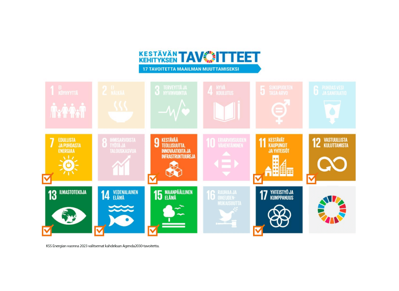 KSS Energia on kansainvälisen YK:n vastuullisuusaloitteen United Global Compactin jäsen. UGC-jäsenyys tarkoittaa, että olemme sitoutuneet kehittämään toimintamme kestävän kehityksen mukaisuutta niin ympäristö-, sosiaalisen kuin taloudellisenkin vastuullisuuden alueilla. Agenda 2030 -tavoitteista kahdeksan on meillä aktiivisesti kehitysalueina.