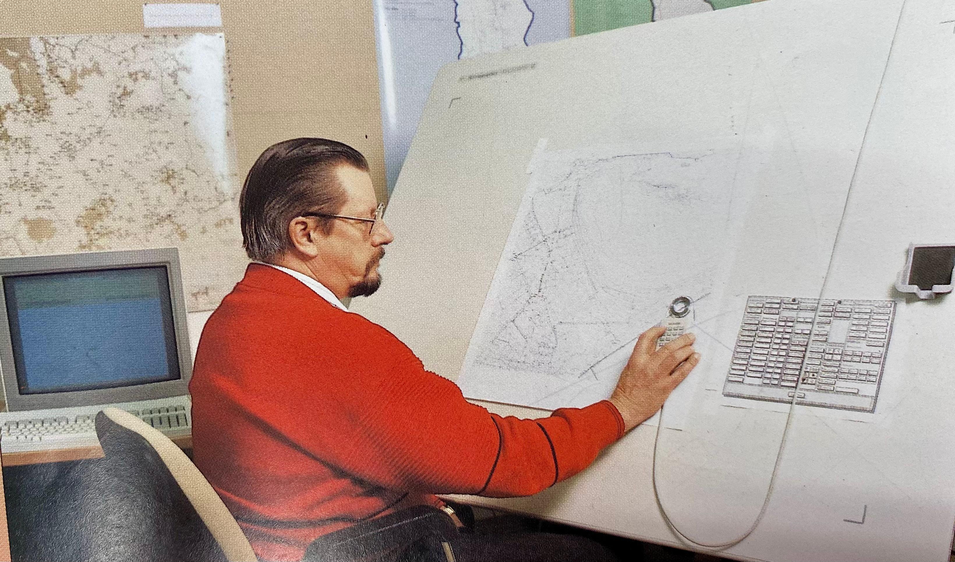 Tässä suunnitteluteknikko Pentti Leinonen siirtää verkostotietoja graafiseen tietojärjestelmään.