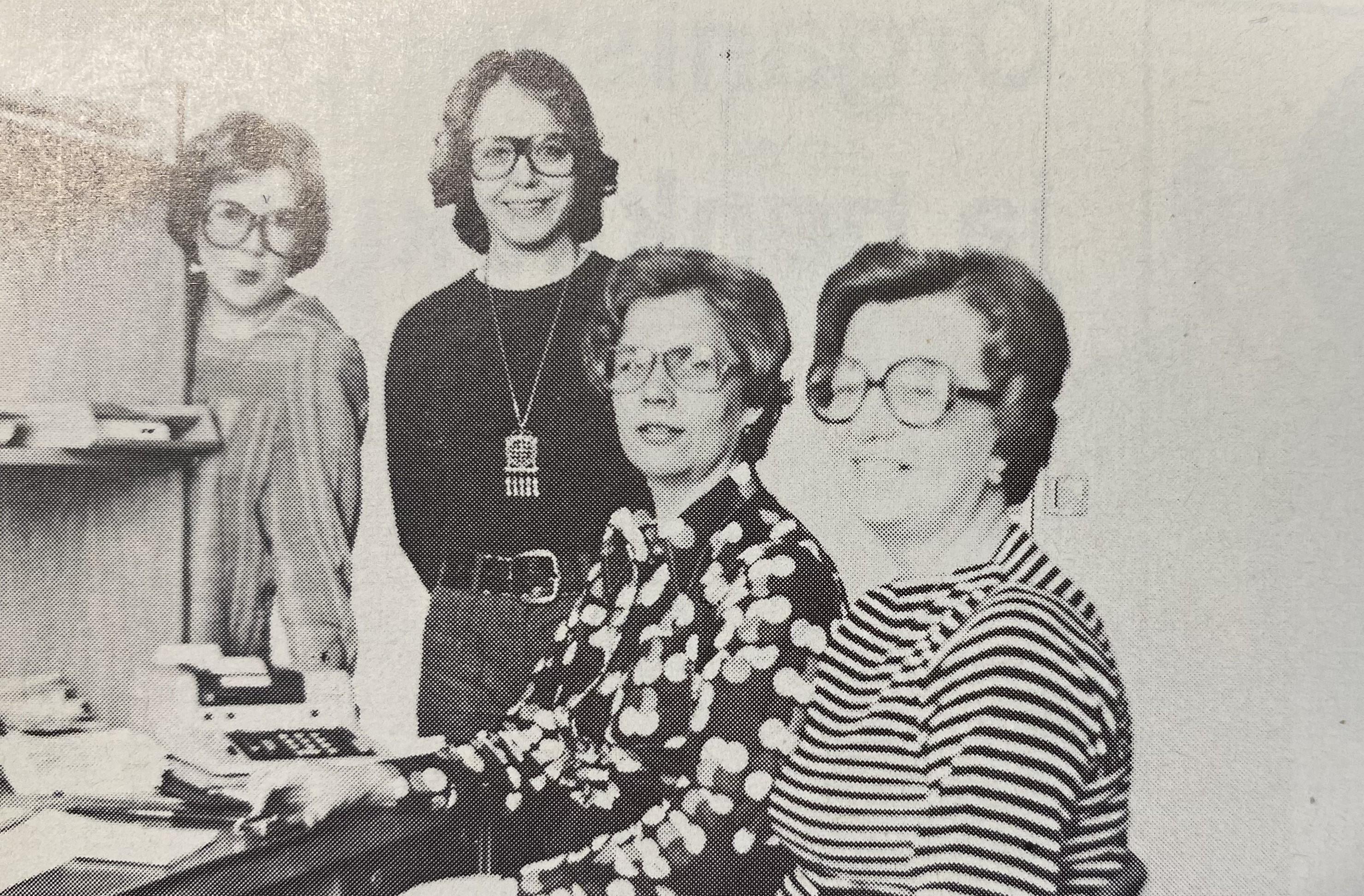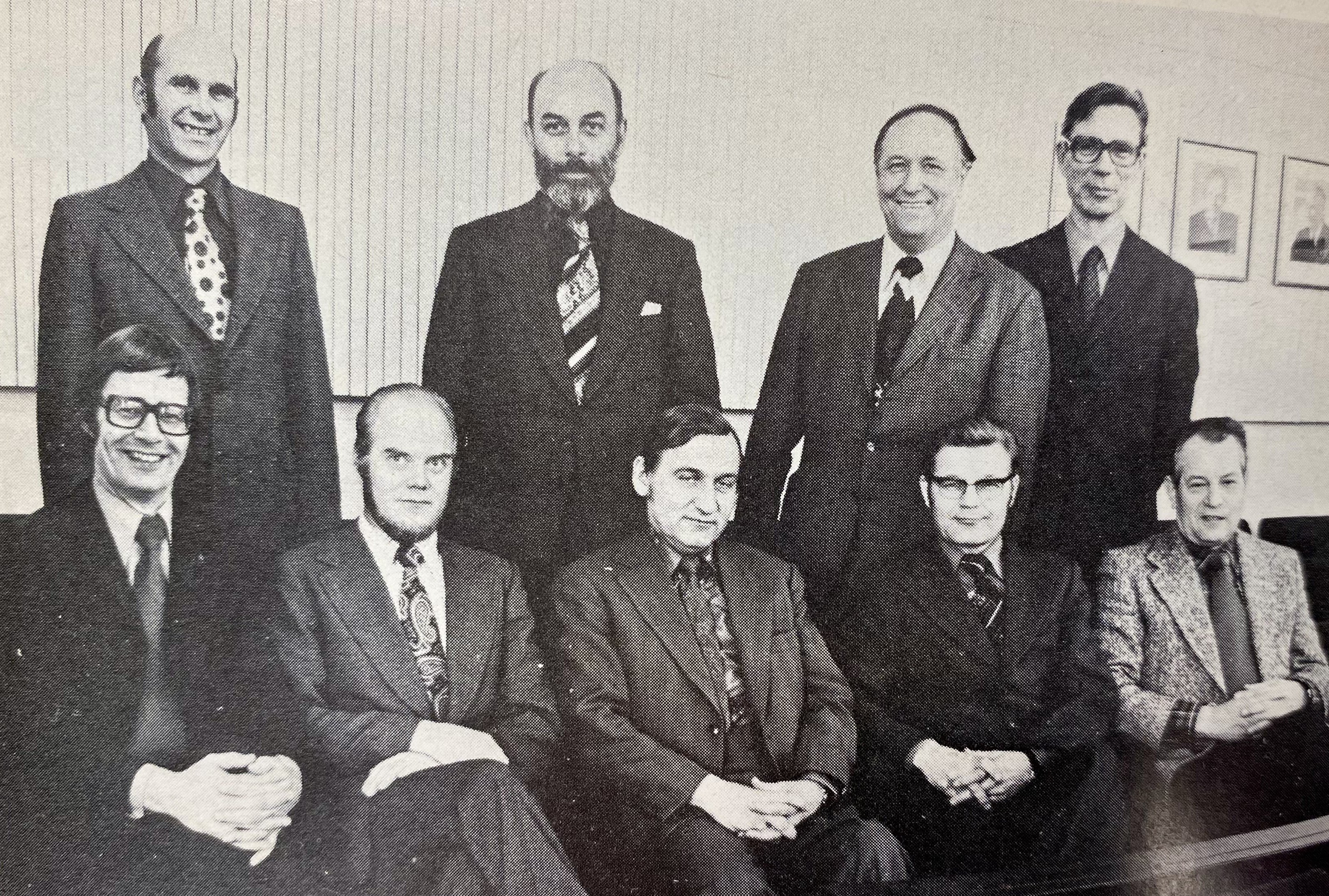 "Uusi, suuri ja kaunis sähkölaitos oli syntynyt", todettiin ensimmäisessä vuosikertomuksessa. Kuvassa vuoden 1975 liittohallitus, liittovaltuuston puheenjohtajat ja johtoryhmä.