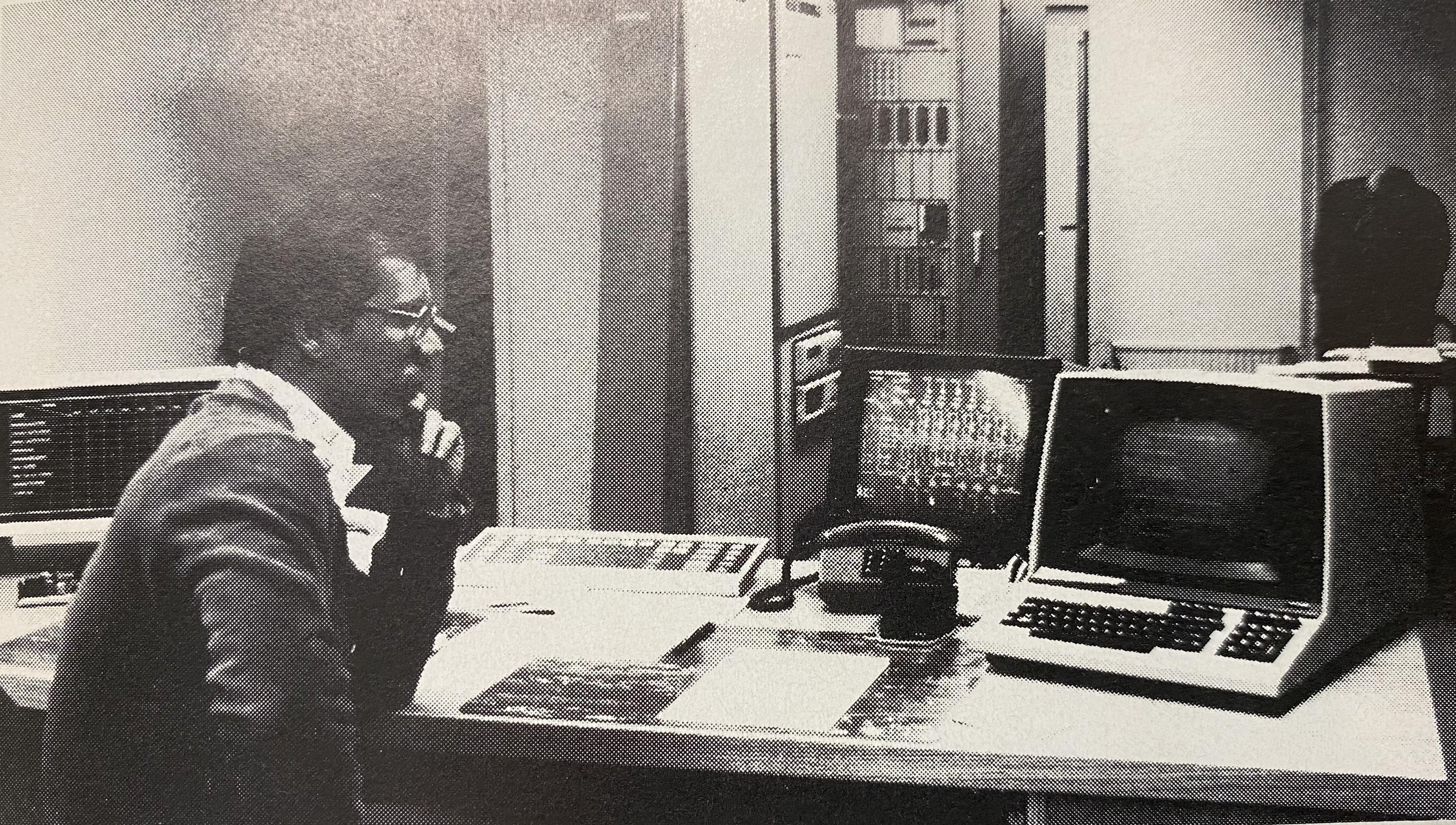 Kuvassa Pekka Vuorenpää tarkkailemassa kaukokäyttövalvomon uusia laitteita Kouvolan piirikeskuksella. Vuoden 1982 suurimmat investointikohteet sähkölaitoksella olivat Kouvolan piirikeskus sekä kaukokäyttö- ja verkkokäskylaitteet. Investoinnin hinta oli yhteensä yli 14 miljoonaa markkaa.