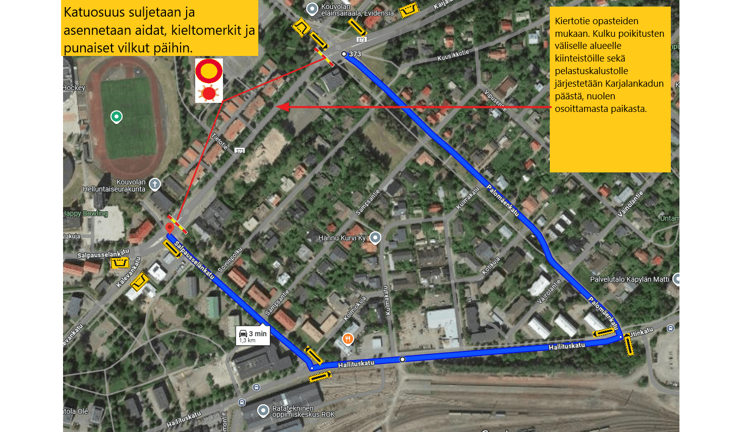 Tie suljettu liikenteeltä: Kalevankatu suljetaan liikenteeltä väliltä Salpakuja – Palomäenkatu. Kiertotie kulkee Salpausselänkatu–Hallituskatu–Palomäenkatu. Korvaava kiertotie merkitty karttaan sinisellä.