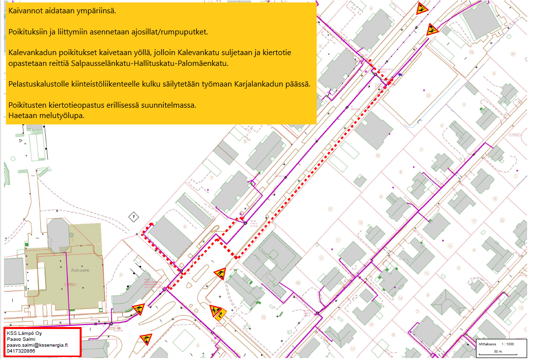 Muuttuneet liikennejärjestelyt liittyvät KSS Lämpö Oy:n tekemään kaukolämpöverkon perusparannustyöhön Kalevankadulla välillä Salpakuja - Kalevankatu 28. Perusparannuksella lisätään kaukolämmön toimitusvarmuutta.
