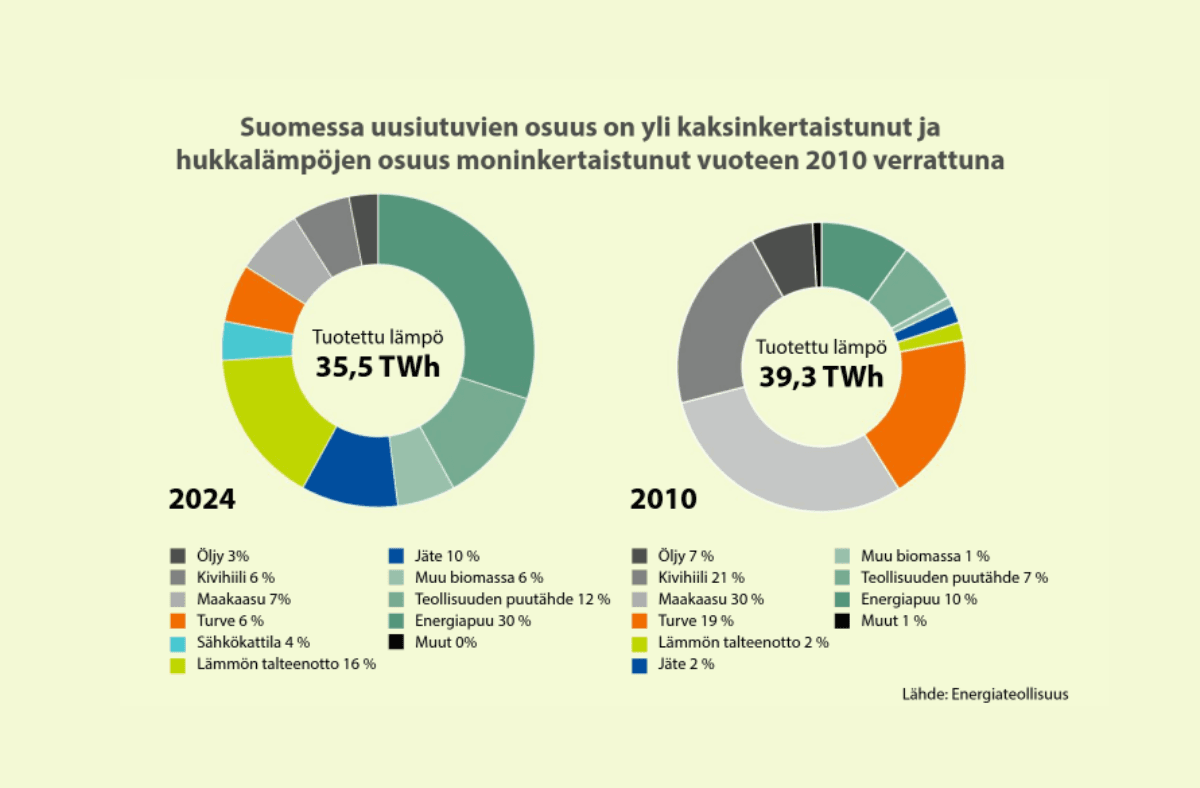Suomen lämpötuotannossa lämmön talteenoton osuus kasvoi 2 prosentista 16 prosenttiin vuosina 2010–2024. Kiertolämpö on korvannut tuontipolttoaineita ja fossiilisia energialähteitä. Energiateollisuus ry:n verkoista ja palveluista vastaava johtaja Janne Kerttula kertoo kiertolämmön kehityskaaren perustuvan yhteiskunnalliseen muutokseen.