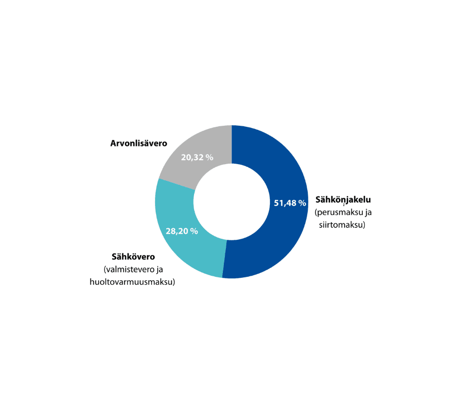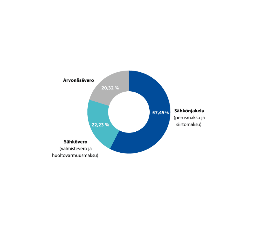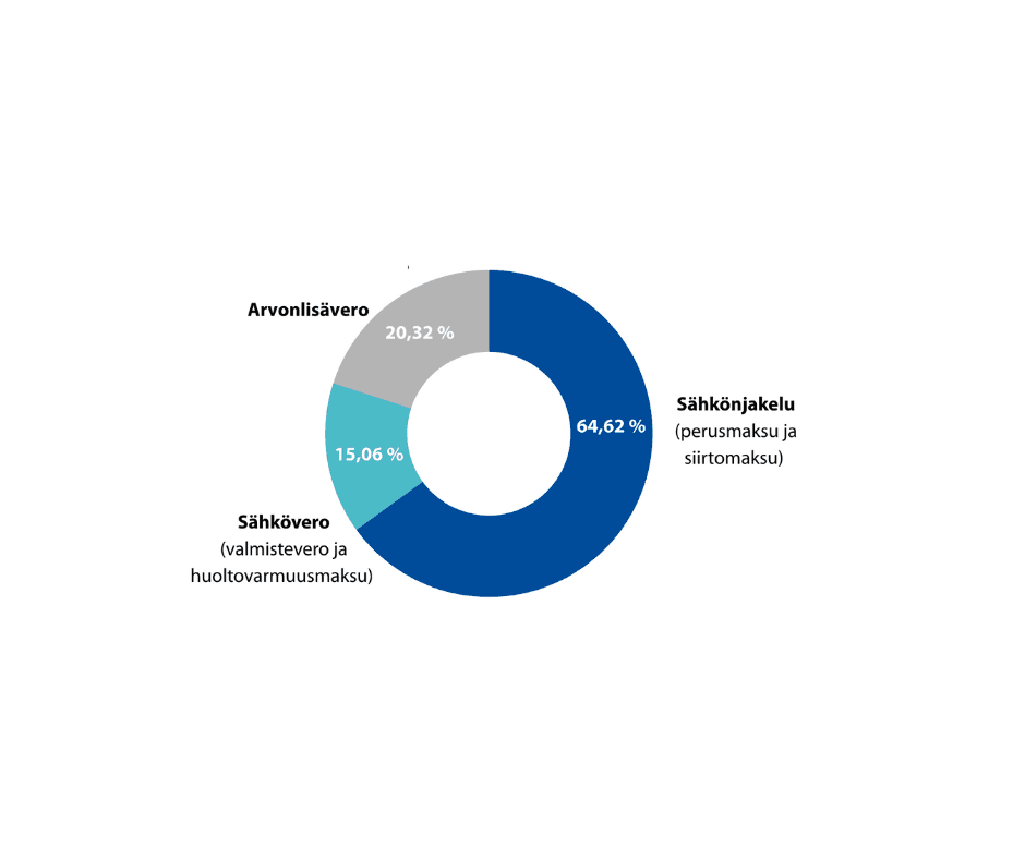 Verot ovat osa sähkönsiirtomaksua. Esimerkiksi viimeisen kohteen 15 000 kWh / vuosi sähköä tarvitsevan kohteen laskusta 48,52 % on veroja.