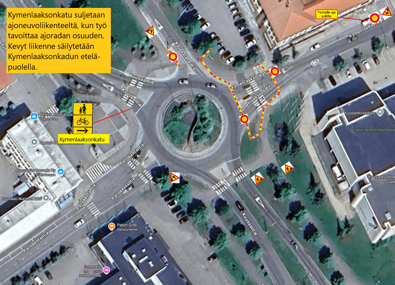 Kaukolämpötyömaa muuttaa liikennejärjestelyjä Kymenlaaksonkadun ja Kuusaantien liikenneympyrän kohdalla maanantaista 8.9.2025 alkaen. Työt kestävät arviolta lokakuun alkuun.
