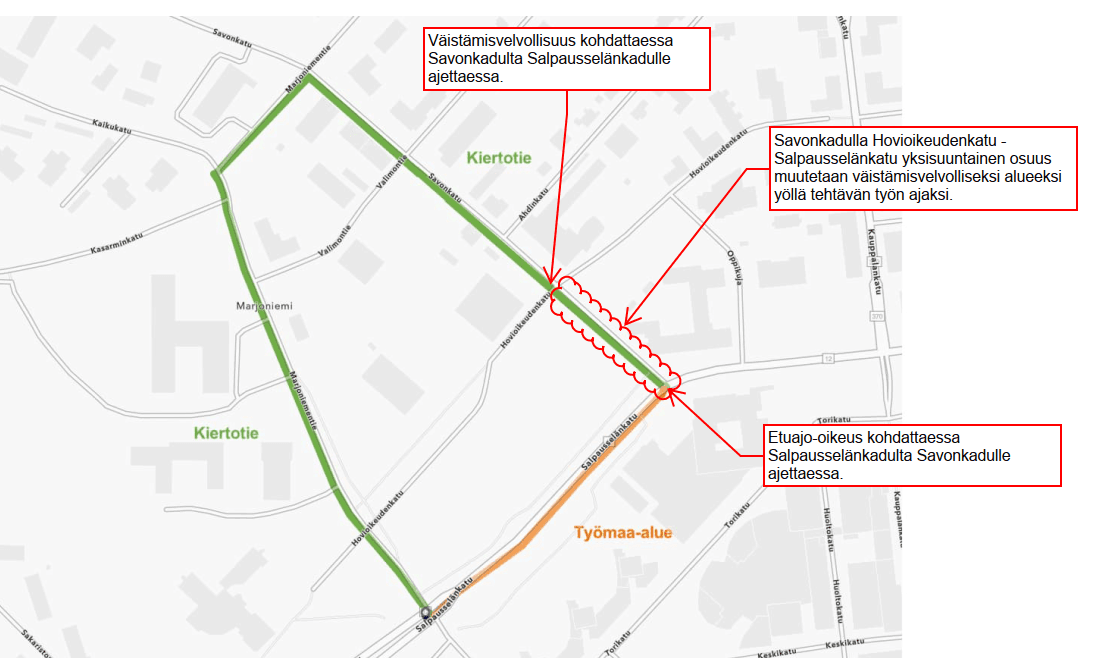 Tie suljettu liikenteeltä: Salpausselänkatu suljetaan liikenteeltä väliltä Marjoniementie – Savonkatu. Korvaava kiertotie merkitty karttaan vihreällä.