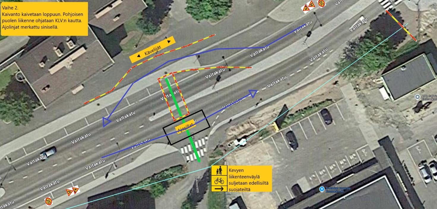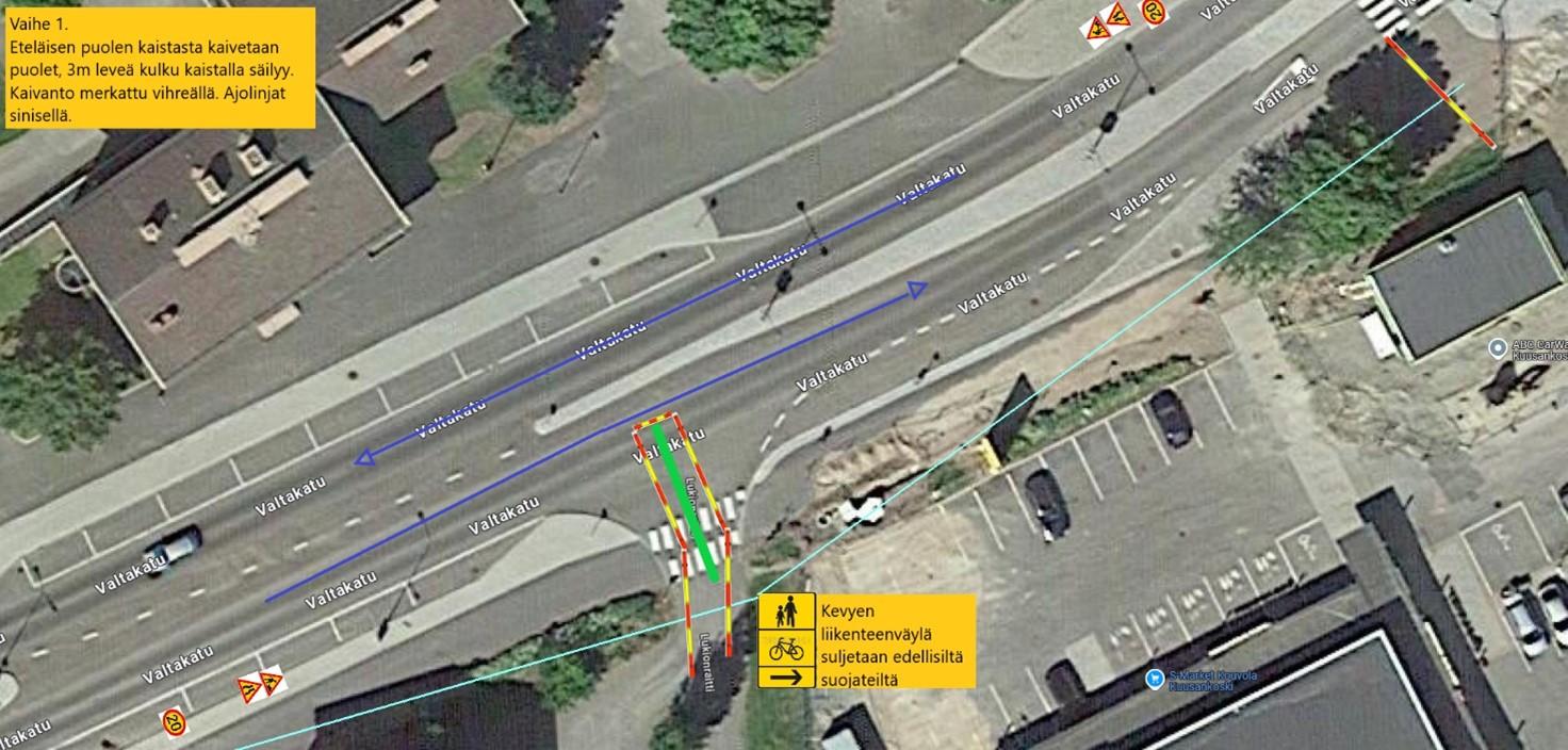 Toinen ajokaista on kaivuutyön ajan pois käytöstä: Liikenne Valtakadulla kulkee molempiin suuntiin, mutta kavennetulla ajoalueella.