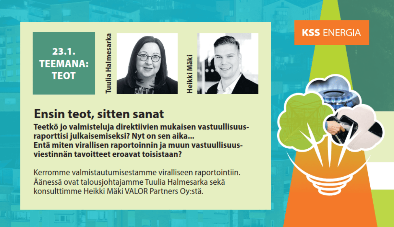 Yleisön kanssa vuorovaikutteisessa tilaisuudessa lavalle nousevat KSS Energian talousjohtaja Tuulia Halmesarka ja VALOR Partners Oy:n konsultti Heikki Mäki. He käyvät läpi KSS Energian omaa valmistautumista viralliseen vastuullisuusraportointiin.
