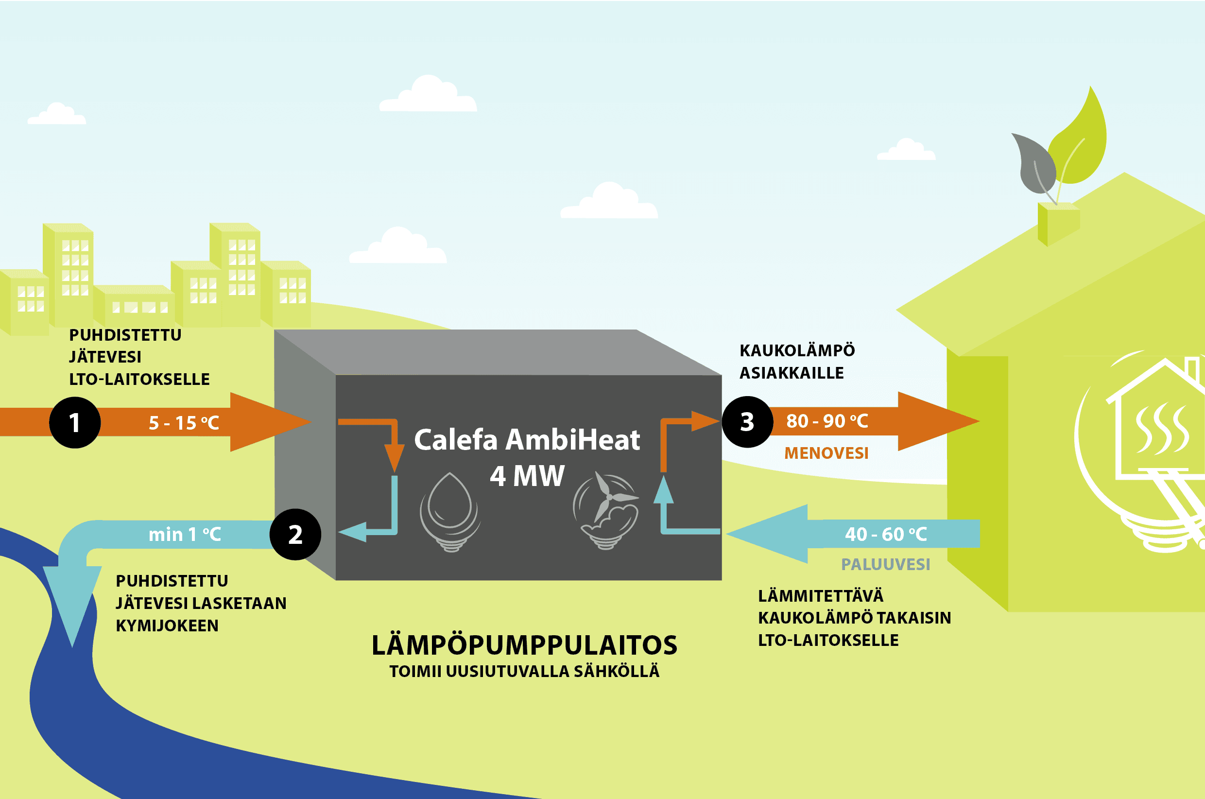 3. Puhdistetusta jätevedestä talteen otettu lämpöenergia hyödynnetään AmbiHeat-lämpöpumpuille, joiden avulla lämmöntalteenottolaitokselta lähtevän kaukolämpöveden lämpötila nostetaan 80–90 °C:een riippuen asiakkaiden lämmöntarpeesta.