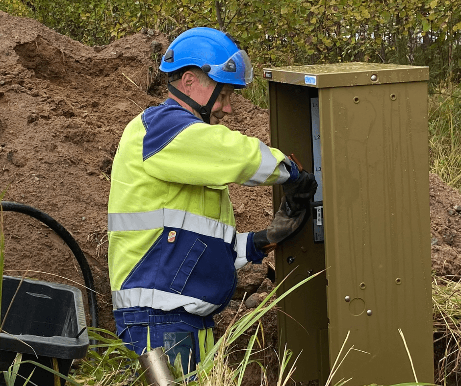 Teollisuustien puolivälissä katujakokaapin parissa työskentelee KSS Rakennuksen kokenut verkostoasentaja Janne Aalto. Hänen tehtävänään on liittää osuudella sijaitsevat kiinteistöt maakaapeloituun sähköverkkoon.