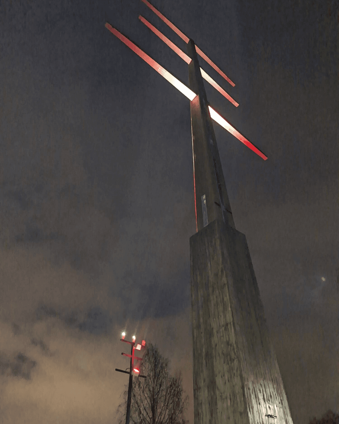 KSS Rakennus toi valoa marraskuun pimeyteen asentamalla tunnelmavalaistuksen Kuusankosken Rantapuistossa sijaitsevan vanhan voimajohtopylvään yhteyteen.