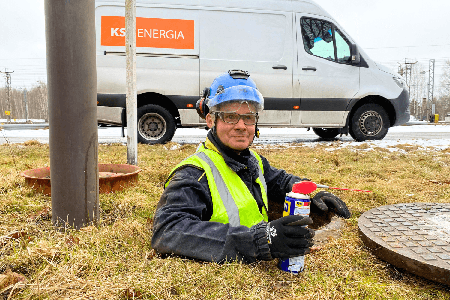KSS Rakennuksella kaivotarkastuksia tehdään turvallisuussyistä aina parityönä. Tällä kertaa kaivoon laskeutuu Jari Pesu. Mukanaan hänellä on hyvän valon lisäksi happihälytin sekä rasvapullo venttiilejä varten.