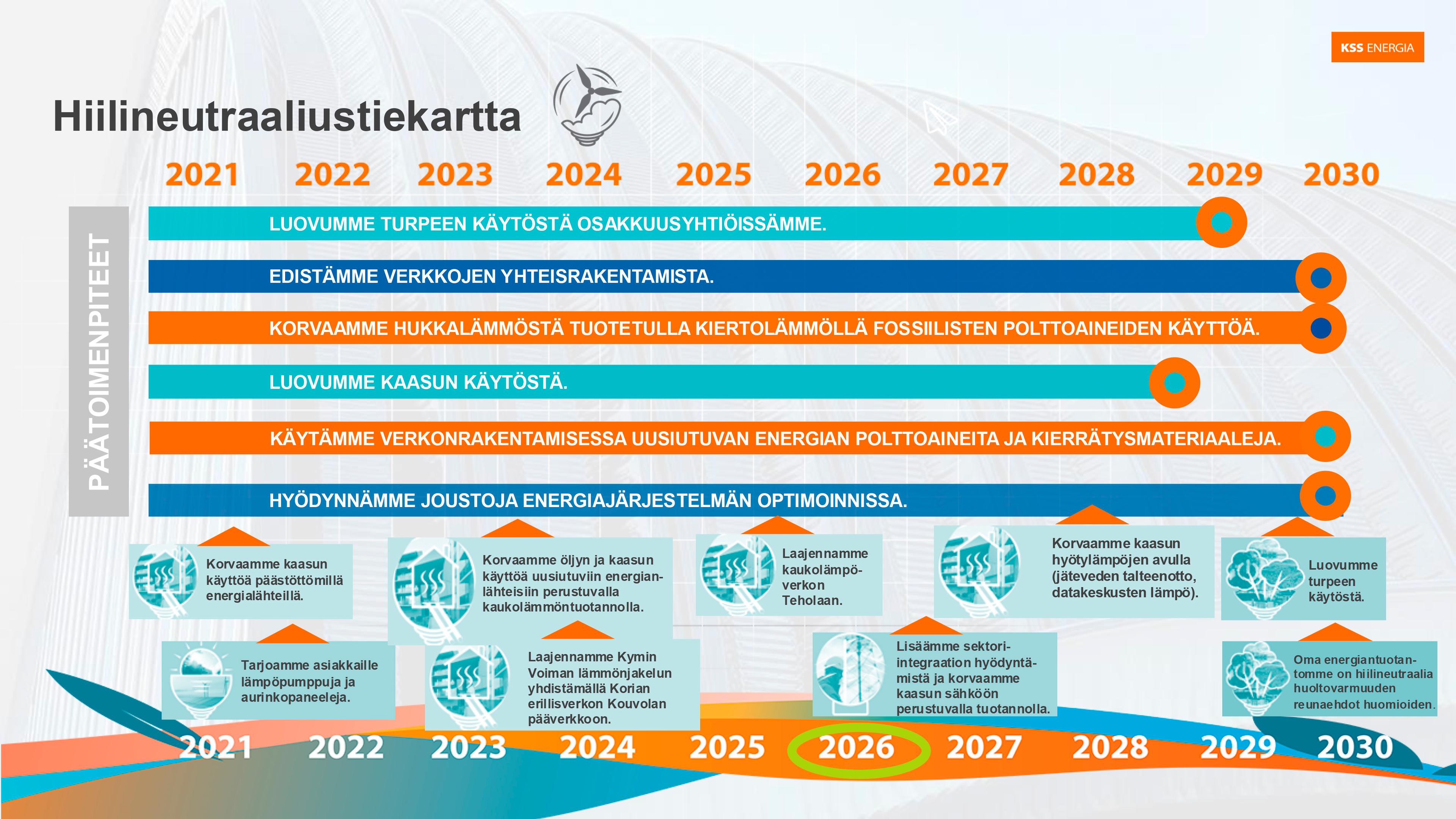 Esimerkiksi kivihiilen ja turpeen laajamittainen käyttö ei ole tuotantomuotona koskaan kuulunut KSS Energian toimintaan. Ensimmäinen hiilineutraalin tuotannon tiekarttamme hahmottui selkeäksi jo viime vuosikymmenellä.