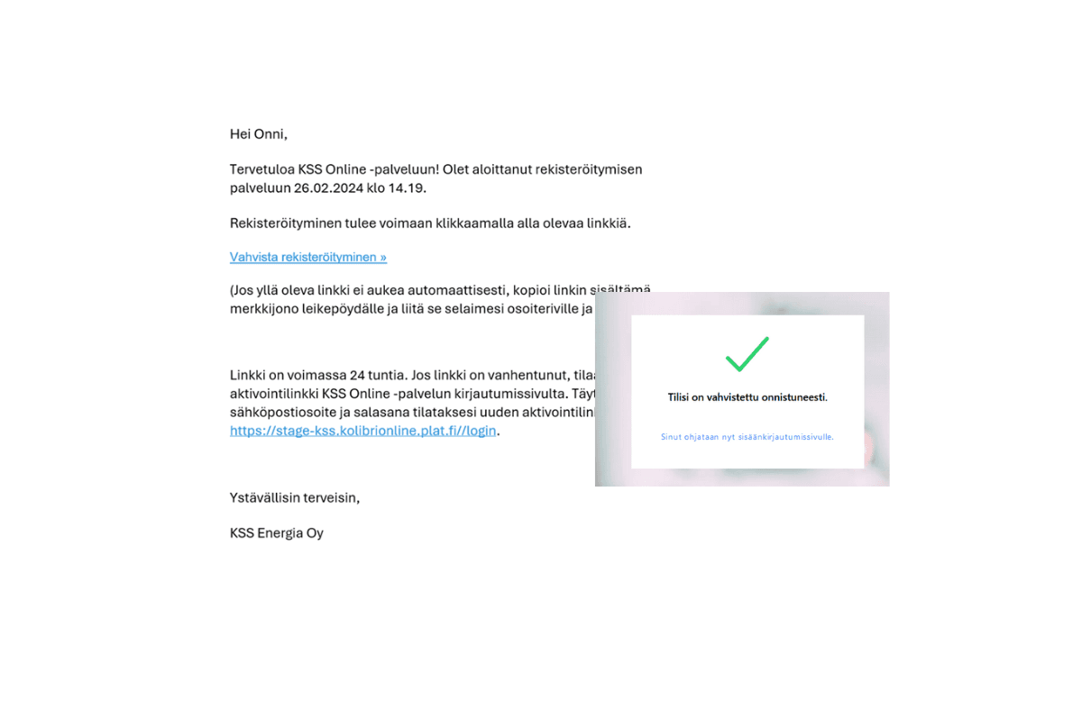 4.1 Vahvista rekisteröityminen sähköpostitse saamastasi linkistä. Tämän jälkeen saat vahvistuksen, jossa KSS Online ilmoittaa rekisteröitymisen onnistuneen.