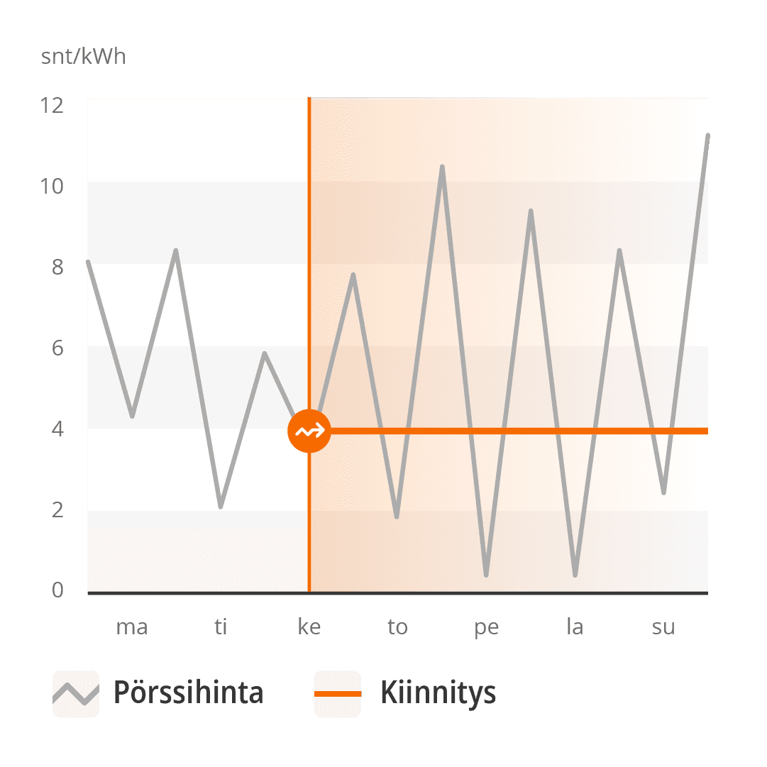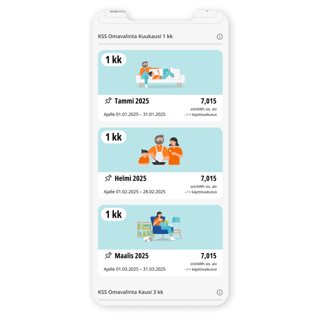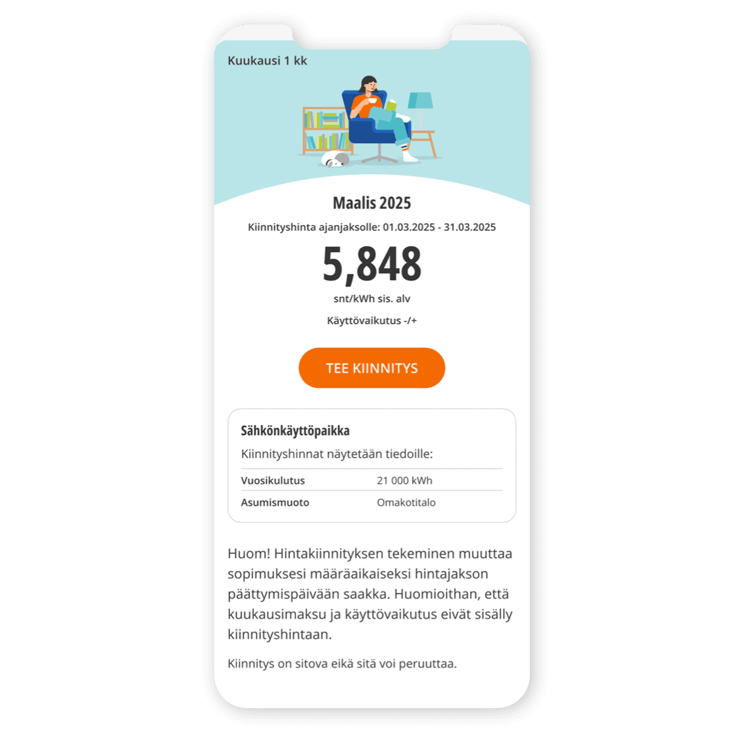 - Kiinnitä sähkön hinta 1 kk, 3 kk tai 12 kk ajaksi - kiinnityksen voi tehdä 30.6.2025 saakka